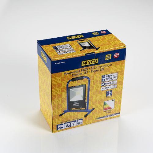 Proyector de haz de luz SMD de 30W con una intensidad de 3.300 Lumenes, emitiendo una luz blanca a 6.500º K con cable de 1,5 metros de longitud, montada sobre un soporte metálico con patas, IP65 Alyco