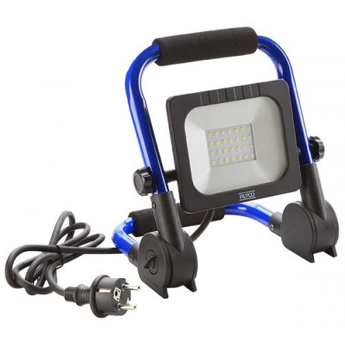 Proyector de haz de luz SMD de 20W con una intensidad de 2.200 Lumenes, emitiendo una luz blanca a 6.500º K con cable de 1,5 metros de longitud, montada sobre un soporte metálico con patas, IP65 Alyco