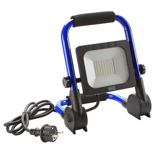 Proyector de haz de luz SMD de 30W con una intensidad de 3.300 Lumenes, emitiendo una luz blanca a 6.500º K con cable de 1,5 metros de longitud, montada sobre un soporte metálico con patas, IP65 Alyco