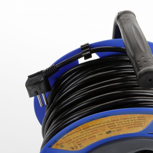 • Enrollador de cable eléctrico con cable de 3 x 1,5 mm2, IP20, marcas CE y GS. Longitud de cable 25 o 50 metros.