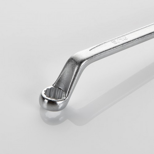 Llave fabricada en Acero al Cromo- Vanadio, dandole larga vida, resistencia a la deformación y alta capacidad de esfuerzo. Forjada de una pieza, y endurecida por tratamiento térmico, dandole mas vida y capacidad de esfuerzo. Cromado exterior para evitar la oxidación, la deformación y el deterioro de la tuerca. Perfil fino y acodado de 75º que facilita el acceso a lugares dificiles. Herramienta óptima para trabajo en tuercas escondidas y rebajadas. Llave de dos bocas estrella con acodado de 75º. Las bocas de estrella tienen las aristas redondeadas. Fabricada en Acero al Cromo- Vanadio, forjada de una sola pieza, endurecida por tratamiento térmico, y con tratamiento superficial de cromado para evitar la oxidación.