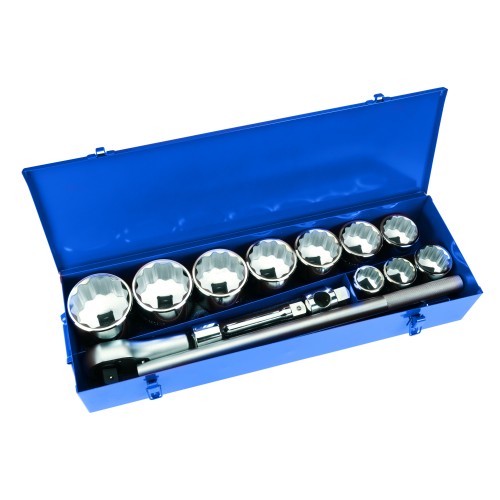 - Juego de llaves de vasos bihexagonales de 1", carraca de 24 dientes con mango desmontable y diferentes accesorios.