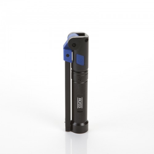 Linterna de aluminio recargable con tres focos: un foco principal COB-LED, foco secundario LED y foco superior LED, con base imantada ALYCO