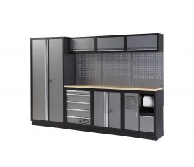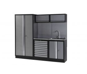 Conjunto de taller de modulos, con armario doble, armario base de 5 cajones, armario de 2 puertas, 2 armarios superiores, 2 paneles perforados y base de trabajo de acero inoxidable Alyco